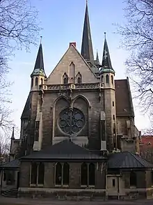 St Thomas' Church (German: Thomaskirche) in the city of Erfurt in Thuringia, Germany, is a United Protestant parish church. It was built in Gothic Revival style in a park on Schillerstraße in the Löbervorstadt district in 1900–1902 to replace the Old St Thomas' Church, which had become too small. It has the second-highest steeple in the city at 72 metres (236 ft) and houses a Gothic altar retable from 1445, which is one of Erfurt's four valuable carved altars.