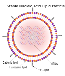 Stable nucleic acid lipid particles (SNALPs) are microscopic particles approximately 120 nanometers in diameter, smaller than the wavelengths of visible light. They have been used to deliver siRNAs therapeutically to mammals in vivo. In SNALPs, the siRNA is surrounded by a lipid bilayer containing a mixture of cationic and fusogenic lipids, coated with diffusible polyethylene glycol.[1]