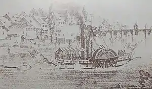 Stadt Frankfurt was finally launched in August 1827.[4] In February 1828 a representative of the DGRM left for Rotterdam to collect the Stadt Frankfurt.[12] In Kaub some board members of the DGRM got on board to see how she would handle the strong currents between Kaub and Bingen. Due to her flat bottom, it was expected that she would also be able to steam through the Binger Loch, which had never been before. With 35 pounds of steam pressure, and 30 rotations a minute, this attempt succeeded. This seemed promising, because this was only two-thirds of her maximum power. In the evening of 5 March 1828 Stadt Frankfurt arrived in Mainz, where she would run some trials.[13] On 8 March 1828 at 6 pm Stadt Frankfurt finally arrived in Frankfurt for the first time.[14]