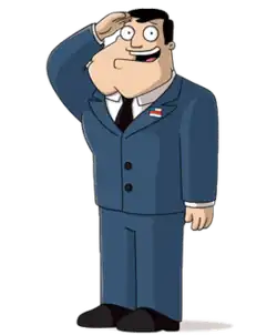 Stan Smith is the exaggeratedly masculine husband of Francine and father of Steve and Hayley. Though Hayley may not be Stan's biological daughter—Francine was revealed to have cheated on Stan at her bachelorette party in the episode "The Kidney Stays in the Picture"—Stan still regards her as such and refused to learn the results of a DNA test.[5] As the Smith family's breadwinner, Stan is an agent for the CIA. Tending to take extreme measures with no regard for others nor potentially disastrous consequences, Stan is portrayed as insanely drastic; endangering; rash; dog-eat-dog; and both inconsiderate and insensitive of others.[6][7] Stan's mentality is of a staunchly conservative Republican and self-proclaimed American patriot. His conservatism is expressed ludicrously with him often coming off as severely intolerant, self-abnegating, and wrongheaded.[8] All the same however, Stan has numerous alternate ways of taking drastic measures beyond politics. As examples—in the episode "Dope & Faith" when Stan found out one of his friends was an atheist, he tried getting him to pray by blowing up his home, spreading the bird flu at his restaurant, brainwashing his wife into thinking she was a lesbian, and taking his kids away; in the episode "I Can't Stan You", Stan evicted his entire neighborhood and his own family just for overhearing some of his neighbors gossiping about him behind his back; in the episode "Four Little Words", Stan framed his wife as a murderer all so as not to hear her say the words "I told you so"; etc.