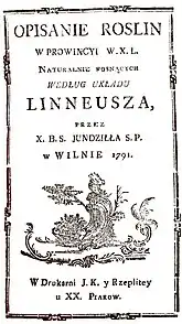 In 1791 he published a description of the plants in the Duchy of Lithuania which used the Linnean system. He received a Merentibus gold medal from King Stanisław August Poniatowski. In 1792, he received a scholar's grant that enabled him to study abroad. He travelled throughout Eastern and Central Europe until 1794, when his grant was discontinued after the Second Partition of Poland. He met Jaquin and others on his travels and learned of Werner's Neptunism. He was again able to obtain financial assistance from Count Ignacy Potocki and Princess Izabela Czartoryska, so he remained in Vienna for a while, organizing a garden of medicinal plants at the University of Veterinary Medicine while continuing to study a wide range of subjects.[1]