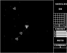 Acornsoft's Starship Command is a multidirectional shooter released in 1983 for the BBC Micro and Acorn Electron. It was available on cassette as well as 5.25" disc for the BBC and ROM cartridge for the Acorn Electron Plus 1 expansion module. The game was written by Peter Irvin who, along with Jeremy Smith, went on to create the arcade adventure Exile.[1][2]