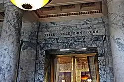 The State Reception Room is an original space built during the 1928 construction of the Washington State Capitol.[1] With a capacity of 211, it is primarily intended for use by the governor to receive dignitaries, but has also been used for other special events, including inaugural balls, the convening of the Washington delegation to the Electoral College, and addresses by state officials to constituent groups.[1][2][3]