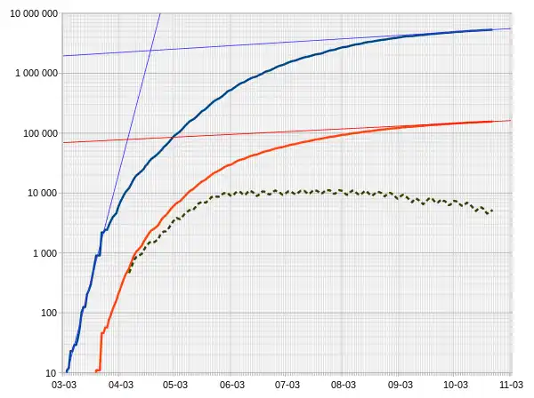Number of cases (blue) and number of deaths (red) on a logarithmic scale.
