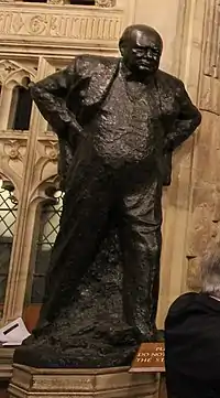 The statue of Winston Churchill is a standing bronze statue of statesman and writer Winston Churchill, situated in the Members' Lobby of the House of Commons of the United Kingdom, part of the Palace of Westminster complex in Westminster, Central London. Churchill is depicted mid-stride, with his hands on his hips.[1]