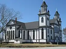The first church built in the community was erected in 1767. Sainte-Anne du Ruisseau became the first Catholic parish in Yarmouth County, founded in 1799 by Father Jean Mandé Sigogne.[4] In 1808, the old church was replaced to serve a growing population. The present church was erected in 1900, replacing the earlier structure which had burned. It is a municipally designated heritage building.[5] Striking in appearance, it was built in Romanesque style and features two towers and original paintings on the ceiling and sanctuary walls.[4]