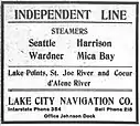 - Lake City Navigation Company. Began freight and passenger operations on the lake and the Coeur d'Alene river in September 1909.[31] Had its office at the Johnson Dock in Coeur d'Alene City.[32] Operated four steamers in September, 1909: Seattle, Harrison, Wardner, and Mica Bay.[32] All property of Lake City Navigation Co. was purchased in April, 1910, by the Perry-Lyon Navigation Co. for the price of $5,000.[33] The assets purchased included the steamers Harrison, Hercules and three barges.[33]