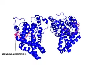 Stearoyl-CoA desaturase (Δ-9-desaturase) is an endoplasmic reticulum enzyme that catalyzes the rate-limiting step in the formation of monounsaturated fatty acids (MUFAs), specifically oleate and palmitoleate from stearoyl-CoA and palmitoyl-CoA.[1] Oleate and palmitoleate are major components of membrane phospholipids, cholesterol esters and alkyl-diacylglycerol. In humans, the enzyme is encoded by the SCD gene.[2]