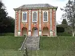 Two Palladian outbuildings serving as Orangery and "Library Room" [25] were built next to the house by John Rolle (1679–1730), MP, and the Library shows above the keystone of its central arch the arms of Rolle impaling the arms of the Walter Baronets of Sarsden, Oxfordshire, the family of his wife Isabella Walter (died 1734). Hoskins states that the manor house itself was rebuilt or remodelled sometime in the 18th century, Pevsner states c. 1709,[26] perhaps therefore at the same time as the building of the outbuildings. An engraving of this Georgian house survives, by James Bingley, published in 1831.