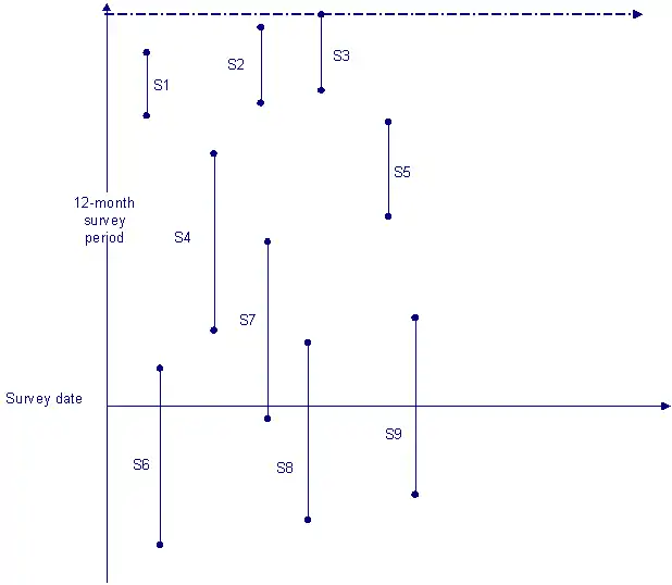 Stock sampling essentially leads to a sample selection problem. This selection issue is akin to the truncated regression model where we face selection on the basis of a binary response variable, but the problem has been referred to as length-biased sampling in this specific context.[4] Consider, for example, the figure below that plots some duration data. If a researcher would revert to stock sampling and only sample and survey individuals at the survey dates (i.e. the survey data, 12 months after the survey date, etc.), there is a high likelihood the short duration spells will be omitted from the sample, as some durations shorter than 12 months are necessarily omitted from the sample:[2]