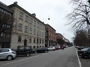 No. 59, on the corner of Dag Hammarskjölds Allé was built for Østre Borgerdyd Gymnasium. The building is from 1884 and was designed by Frederik L. Levy and Henrik Hagemann.[6]