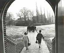 The school was founded in 1487 by Sir Edmund Shaa, the 1482 Lord Mayor of London whose will provided for a school and a small chapel in St Mary's Church in Stockport and funds to maintain a priest to chant masses and teach grammar.[1] Alexander Lowe, the mayor of Stockport, left the school a permanent home in Chestergate in his will. The school became increasingly successful with pupils being accepted at the ancient universities of Oxford, Cambridge and St Andrews, while the curriculum became increasingly broad with the rudiments of Greek joining a study of Latin, the Christian religion, writing in English and arithmetic.[2][3] Five years after the Worshipful Company of Goldsmiths met to discuss the possibility of transferring the school to a different site, new buildings open where Greek Street meets New Wellington Road. As well as paying for the building, the Goldsmiths also increased the salaries of the headmaster and usher and paid the running costs.[1]
