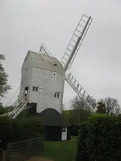 Probably built around 1781, it was named Stocks Mill after the village stocks that stood nearby. The mill may be older and may have been moved from Stone in Oxney, with the date 1781 carved into the main post denoting its re-erection.[3] The Mill House was at one time used as the parish Poorhouse.[4] The mill was last worked circa 1900, and was then preserved by Norman Forbes-Robertson, who owned the mill and Mill House.[5] The mill passed into the ownership of the artist Randolph H Sauter.[6] and then Sir Edward Parry. The mill was repaired in 1958, and in 1968 a new stock and pair of sails was fitted by the millwright Derek Ogden.[3] In 1980, the mill was acquired by Kent County Council and the Friends of Stocks Mill was set up to allow the mill to be opened to the public. The mill underwent a restoration programme starting in 2002 and partly funded by the National Lottery, which included two new sails amongst other work. Some of the milling machinery which had been removed over the years was recreated.[7] The mill was reopened to the public in 2004.[8]