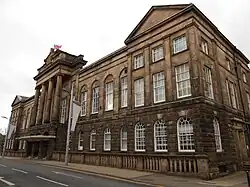 The council meets and has its headquarters at the Civic Centre on Glebe Street, a complex of buildings which incorporates both the Stoke-on-Trent Town Hall of 1834 (which contains the council chamber) and a large extension to the north-east built in 1992.[24][25]