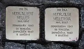 HERE LIVED DR. MED. OLGA MELLEROVÁ BORN 1897 DEPORTED 1943 TO THERESIENSTADT MURDERED 1943 IN AUSCHWITZ |