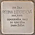 Regina Ledererová, also Rerina or Rivka, was born on 13 November 1869 in Lednice. Her parents were Salamon and Sofie. Their last name, i.e. Rerina's maidens name, is not known. She was a housewife and married to Beniamin Lederer. She became a widow. On 26 November 1942, she was deported from Klatovy to Theresienstadt concentration camp by transport Cd, together with her brother-in-law Vojtěch Lederer and his wife. Her transport number was 557 of 651. Both relatives died in Theresienstadt in the course of 1943. On 15 December 1943, she was deported to Auschwitz concentration camp by transport Dr. Her transport number was 1272 of 2,519. There she was murdered by the Nazi regime.[41][42]
