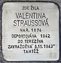 Her daughters Adéla and Marta, their husbands Markus and Richard as well as her grand children Kurt and Margita were also murdered by the Nazi regime. There are two reports on Valentina Straussová in Yad Vashem. One is based on the Theresienstädter Gedenkbuch, the other one was filed by her daughter Herta Fridman.[7][8] Altogether, Herta Fridman submitted 39 reports on murdered family members to Yad Vashem.[9] |