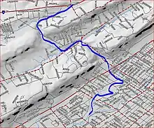 The Stony Brook starts at 40°39′12″N 74°27′11″W / 40.65333°N 74.45306°W, near the intersection of Hillcrest Road and I-78. It flows southeast, crossing Stirling Road, before turning southwest. It then turns northeast and flows into Watchung Lake. In Watchung Lake, it joins an unnamed tributary from the northeast and another one from the southwest. It then leaves the lake and goes southeast through the town of Watchung. It passes through the Stony Brook Gorge in the first Watchung Mountain and over the Wetumpka Falls.
