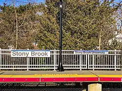 When the Flowerfield station (to the west) closed in 1958 and the Setauket station (to the east) closed in 1980, Stony Brook station became the penultimate station on the Port Jefferson Branch. In 1989, the station underwent a renovation project, including 12-car-long high-level platforms, a pedestrian overpass, and straightening of the tracks, as well as a new parking lot on the Stony Brook University campus.[6][7] Beginning in April 2010, the Metropolitan Transportation Authority planned a renovation project that was intended to last until January 2011.[8]