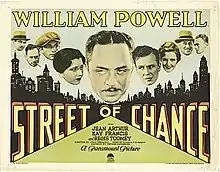 Street of Chance is a 1930 American pre-Code film directed by John Cromwell and starring William Powell, Jean Arthur, Kay Francis and Regis Toomey. Howard Estabrook was nominated for the Academy Award for Best Writing, Achievement.