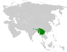 It is found from the eastern Himalayas to northern Vietnam. Its natural habitat is subtropical or tropical moist montane forests.