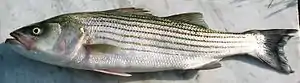 The striped bass (Morone saxatilis), also called the Atlantic striped bass, striper, linesider, rock, or rockfish, is an anadromous perciform fish of the family Moronidae found primarily along the Atlantic coast of North America. It has also been widely introduced into inland recreational fisheries across the United States. Striped bass found in the Gulf of Mexico are a separate strain referred to as Gulf Coast striped bass.[2]
