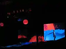 West performed a partial version of "Stronger" live at the Concert for Diana held at Wembley Stadium on July 1, 2007, to a crowd of 63,000 people. An estimated 500 million people watched the event in over 140 countries.[30] Daft Punk made a surprise appearance at the 50th Grammy Awards on February 10, 2008, to join West in performing a reworked version of the song on stage at the Staples Center in Los Angeles. A press release specified that this was the very first televised live performance by Daft Punk in their career.[31] In an interview, de Homem-Christo specified that the live performance of "Stronger" at the 50th Grammy Awards was "truly a collaboration from the start. We really did it all hand in hand."[32]