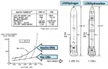 A series of launch vehicles was proposed, based on the proposed Space Transportation Main Engine (STME) liquid-fuel rocket engine. The STME was to be a simplified, expendable version of the RS-25 engine. The NLS-1 was the largest of the three proposed vehicles and would have used a modified Space Shuttle external tank for its core stage. The tank would have fed liquid oxygen and liquid hydrogen to four STMEs attached to the bottom of the tank. A payload or second stage would have fit atop the core stage, and two detachable Space Shuttle Solid Rocket Boosters would have been mounted on the sides of the core stage as on the Shuttle. Period illustrations suggest that much larger rockets than NLS-1 were contemplated, using multiples of the NLS-1 core stage.[4]