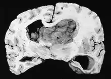 Photograph of a brain section containing a subependymal giant cell astrocytoma