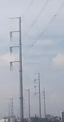 With the construction of the Skyway Stage 3, several steel poles are being replaced by newer ones specifically those along the Araneta segment and also added new poles on certain portions of the line. The newer steel poles were made of porcelain discs (15) and 3 horizontal pole-mounted porcelain insulator. Since the construction of Skyway Stage 3, the newer design is flag design with the deadend insulators (made of polymer/porcelain).