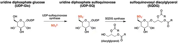 In cyanobacteria and plants, SQDG is synthesized in two steps. First, UDP-glucose and sulfite are combined by UDP-sulfoquinovose synthase (SQD1) to produce UDP-sulfoquinovose. Second, the sulfoquinovose portion of UDP-sulfoquinovose is transferred to diacylglycerol by the glycosyltransferase SQDG synthase, to form SQDG.[12]