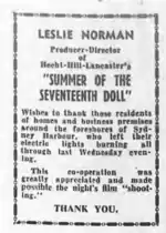 - ↑ "Premiere of 'Doll' Film". The Sydney Morning Herald. 3 December 1959. p. 6.