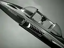 There were several working models of Supercar, which was designed by art director Reg Hill.[11] The larger, hero model was about seven feet (2.1 m) long and cost £1,000 to build.[1] Made of lightweight wood and Perspex), it was constructed by Laurie Barr of Aeronautical and General Modelmakers (now Mastermodels). A mid-sized model, around one metre (3 ft 3 in) long and sculpted by Slough craftsman Bill James, as well as a smaller model measuring about 0.5 metres (1 ft 8 in), were used for the titles. One of the smaller models, used in distance shots, was about nine inches (23 cm) in length and was also sculpted by Bill James. John Peel likens Supercar's appearance to that of the 1959 Cadillac Fleetwood Sixty.[12]
