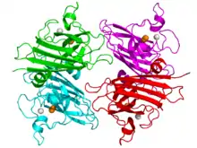 Crystal structure of the human SOD1 enzyme (rainbow-color N-terminus = blue, C-terminus = red) complexed with copper (orange sphere) and zinc (grey sphere)[16]