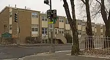Little actual redevelopment occurred, although most of the buildings were demolished. The Sursum Corda co-operative declined to participate in the redevelopment. But the owners of other structures, such as the Golden Rule complex (owned by Bible Way Temple, a nearby church) did.[1] Temple Court Apartments was the largest housing complex in the area, with 520 units. But the Bush Companies, which owned Temple Court, wanted to out of the federal and city government-subsidized low-income housing plans and wanted to convert its units to market-rate housing. The District of Columbia exercised eminent domain over Temple Court, seizing it and ensuring it would not block the Northwest One plan.[11] Demolition of the participating structures occurred in 2008, with residents dispersed to other public housing projects in the city.[1][lower-alpha 2] In 2009, the redeveloped Walker-Jones Education Campus and the Northwest One Neighborhood Library opened. But then redevelopment stopped. DCHA never assigned anyone to oversee the project, which left no one to push the developers to fulfill their agreement. DCHA itself was required to move from its headquarters at 1133 North Capitol Street NE to vacate and demolish its own headquarters to make way for the planned new housing, but the agency never did so. DCHA then lost the blueprints for the project, and only relocated them in June 2013. DCHA then discovered—after it had demolished the building—that the Temple Court Apartments were built with a mortgage insured by the United States Department of Housing and Urban Development. This $3.9 million insurance policy required that only subsidized housing could be built on the Temple Court land, but the Northwest One project envisioned market-rate, office, and retail use there. Mayor Adrian Fenty and Mayor Vincent C. Gray both pledged to resolve the issue, but never did. Only two of the many planned Northwest One buildings were constructed. One was the 2M Street Apartments at 2 M Street NE. Built with $16.8 million in DCHA funds, only 93 of its 314 units are subsidized for low-income residents.[1] The other was the Severna Apartments, owned and built by Bible Way Temple.[11] The $15.7 million building (constructed with $1.9 million in DCHA funds) opened in 2011. All of its units are for low-income residents.[1]