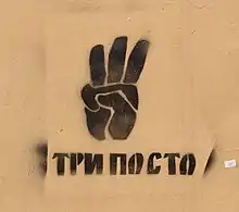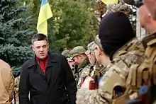 In February 2004, the arrival of Oleh Tyahnybok as party leader led a significant change in moderating the Social-National Party's image.[3][39] It changed its name to the All-Ukrainian Union "Svoboda",[3] and abandoned the "I + N" (Ukrainian «Ідея Нації» "Idea Natsii" = "idea of a nation") Wolfsangel logo (a symbol popular among neo-Nazi groups)[3][40] with a three-fingered hand reminiscent of the 'Tryzub' pro-independence gesture of the late 1980s.[40] Svoboda also pushed neo-Nazi and other radical groups out of the party,[41] distancing itself from its neofascist past while retaining the support of extreme nationalists.[39] Andrushkiv, former head of the party, rejected Tyahnybok's claim that Svoboda was successor party to the SNPU and called Svoboda 'a different political phenomenon.' Both he and Andriy Parubiy would leave the 'new' party following its transformation.[42]