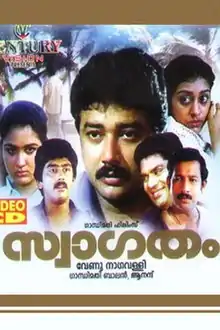Swagatham (English: Welcome) is a 1989 Indian Malayalam film, directed by Venu Nagavally and produced by Anand. The film stars Jayaram, Urvasi, Ashokan and Parvathy in the lead roles. The film has musical score by Rajamani.[1][2][3]