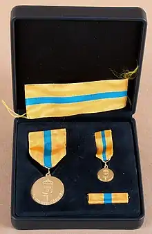 The medal is made in two versions, silvered bronze ("silver") and gilded bronze ("gold") with 31 mm diameter. The obverse shows the Swedish Armed Forces heraldic arms and around the outer edge the text "For national defense" (För rikets försvar). The reverse is blank with a laurel wreath around the outer edge and can be by the unit be fitted with the current name or personal identity number and or year in engraving. The medal is also made in miniature.[1] The ribbon is yellow moiré with a broad blue stripe on the middle.[3]
