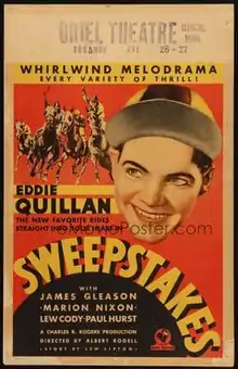Sweepstakes is a 1931 American pre-Code comedy film directed by Albert S. Rogell from a screenplay written by Lew Lipton and Ralph Murphy. The film stars Eddie Quillan, James Gleason, Marian Nixon, Lew Cody, and Paul Hurst,[1] which centers around the travails and romances of jockey Buddy Doyle, known as the "Whoop-te-doo Kid" for his trademark yell during races. Produced by the newly formed RKO Pathé Pictures, this was the first film Charles R. Rogers would produce for the studio, after he replaced William LeBaron as head of production. The film was released on July 10, 1931, through RKO Radio Pictures.