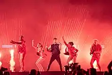 The Swiss performance featured Luca Hänni performing on stage in a sleeveless black t-shirt with white shoulder trim and black trousers and boots with white trims. Hänni was flanked by four dancers all dressed in red and together performed a choreographed dance routine. The stage colours were black and red and the LED screens displayed blurred-like to laser-like thin lights that appeared from the ground. The performance also featured pyrotechnic firework effects.[22][23][24] The four dancers that joined Luca Hänni were: Daniel Asamoah, David Lei Brandt, Hannah Levitt-Collins and Keisha von Arnold. An off-stage backing vocalist was also featured: Greg G. Curtis.[25] The creative director of the Swiss performance was Sacha Jean-Baptiste.[26]