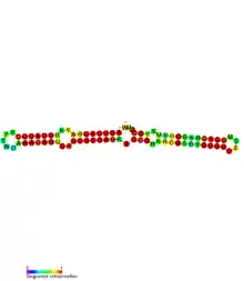 SymR is an antisense RNA meaning its secondary structure has characteristic stem-and-loop elements as well as unpaired regions flanking the structure.[13] The predicted secondary structure of SymR showcases a loop containing the nucleotide sequence CCAG.[4] This characteristic loop is shared with the lstR-1 and OhsC RNA proteins and is predicted to be a binding site for other proteins.[4] Currently, there are no known files on the RCSB protein data bank or SWISS-MODEL repository that indicate a predicted tertiary structure of SymR.