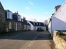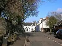 Hugh Glover held the lands of Townend circa 1701-4 and in 1733 William Kelso of Dankeith sold the lands to George Boyd of East Overloan Farm. William Hay Boyd, Esq. of Her Majesty's 20th Regiment of Infantry in the Crimea[26] and was the owner of Townend House (NS 37652 31552) and estate in 1839.[21] Townend is an 18th-century building with a Victorian Italianate wing. A dated lintel in the walled garden may have come from an earlier building on the site; the old stables, were converted into a small dwelling in the 1960s.[27] In recent times Townend Cottage has functioned as a nursing home,[13] Townend Cottage, circa 1810, situated in the village was its former dower house. The Hay-Boyds gave land for the village hall, a school, and a garden next to the church.[26]