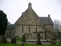 The parish church was founded in the 12th century by Simon Loccard and is the oldest functioning church in Ayrshire.[13] It belonged to the Trinitarian Monastery at Fail (just outside Tarbolton). The Church was restored in the 18th century and again in 1919. This restoration by P. MacGregor Chalmers[13] revealed that the earlier alterations of 1797[14] had covered up some fine architectural features, including the 13th century windows[10] and the open-work timber roof. Three windows with semi-circular heads are located in the gable, with heavy hood moulds and dog-tooth ornamentation, the finest of their style in Scotland.[13] The base slab of an aumbrey incorporating a piscina sits as the sill of a south-facing window.[13] The church received an addition and alterations in 1797 which increased the accommodation of the building, but detracted considerably from the unspoilt appearance. A belfry, possibly incorporating some medieval work, was erected on the east gable end in the 17th century.[15] Notable stained glass windows are on display, by Gordon Webster, Douglas Strachan, and others. The patronage of the church passed through several hands and was at length acquired by the Earl of Eglinton.[5] The old manse in Kerrix Road is now known as Symington House (NS 38350 31325).[10]