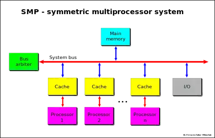 Symmetric multiprocessing or shared-memory multiprocessing[1] (SMP) involves a multiprocessor computer hardware and software architecture where two or more identical processors are connected to a single, shared main memory, have full access to all input and output devices, and are controlled by a single operating system instance that treats all processors equally, reserving none for special purposes. Most multiprocessor systems today use an SMP architecture. In the case of multi-core processors, the SMP architecture applies to the cores, treating them as separate processors.