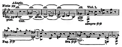 The second subject is, in the words of Donald Tovey, "a conversation between the bassoon, the oboe, and the flute."[17] The development section takes the tonality towards the remote key of B major before returning to the tonic B♭, and the recapitulation and coda follow the conventional classical form.[17]
