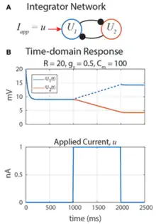 The neuron model used for SNS has leak dynamics meaning a current is always leaking out of the neuron to return it to resting potential. This means a single neuron modelled in this fashion is incapable of storing data. A system of two neurons, however, are capable of this if linked via mutually inhibitory transmission synapses with a marginally stable equilibrium curve. The mutual inhibition means that the activation levels are maintained instead of leaking away and the system state changes continuously for the duration of an applied stimulus (integration). Integration subnetworks, while not necessarily complicated in structure, are the most complex to define and prove. As such the derivation and proof of marginal stability are worth an in-depth read here [1] as a cursory overview would be insufficient.