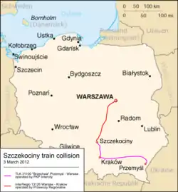 - ↑ "Poland defends rail safety after collision kills 16". CTV News Winnipeg. 4 March 2012. Retrieved 9 March 2012.