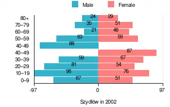 According to the 2002 Poland census, there were 1,054 people residing in Szydłów village, of whom 50.7% were male and 49.3% were female. In the village, the population was spread out, with 23.6% under the age of 18, 37.4% from 18 to 44, 20.5% from 45 to 64, and 18.5% who were 65 years of age or older.[1]