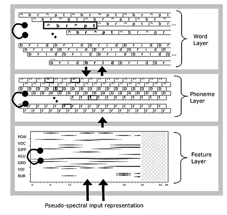 The TRACE model is a connectionist network with an input layer and three processing layers: pseudo-spectra (feature), phoneme and word. Figure 2 shows a schematic diagram of TRACE. There are three types of connectivity: (1) feedforward excitatory connections from input to features, features to phonemes, and phonemes to words; (2) lateral (i.e., within layer) inhibitory connections at the feature, phoneme and word layers; and (3) top-down feedback excitatory connections from words to phonemes. The input to TRACE works as follows. The user provides a phoneme sequence that is converted into a multi-dimensional feature vector. This is an approximation of acoustic spectra extended in time. The input vector is revealed a little at a time to simulate the temporal nature of speech. As each new chunk of input is presented, this sends activity along the network connections, changing the activation values in the processing layers. Features activate phoneme units, and phonemes activate word units. Parameters govern the strength of the excitatory and inhibitory connections, as well as many other processing details. There is no specific mechanism that determines when a word or a phoneme has been recognized. If simulations are being compared to reaction time data from a perceptual experiment (e.g. lexical decision), then typically an activation threshold is used. This allows for the model behavior to be interpreted as recognition, and a recognition time to be recorded as the number of processing cycles that have elapsed. For deeper understanding of TRACE processing dynamics, readers are referred to the original publication[1] and to a TRACE software tool that runs simulations with a graphical user interface.