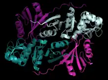 The homotetrameric tRNA-intron lyase, α4, only found in Methanocaldococcus jannaschii, takes on a rectangular parallelepiped conformation consisting of four α subunits of 179 amino acids each.[6] Each α subunit is made up of five α helices and mixed β sheets. The homodimeric tRNA-intron lyase, α′2  is composed of two α′ subunits that appear to be a fusion protein made up of two α subunits connected by a linker.[8] The α′2 structure is only found in Archaeoglobus fulgidus and Thermoplasma acidophilum.[8] The heterotetramer (αβ)2 structure is found in Nanoarchaeum equitans, Pyrobaculum aerophilum, Aeropyrum pernix, and Methanopyrus kandleri.[9] This structure is composed of two catalytic α subunits and two structural β subunits, with similar function as both of the previously described structures.[9] The last structure, 𝜀2, is a homodimer found only in Candidatus Micrarchaeum acidiphilum.[6] Each subunit is composed of three smaller units: αN, α, and βC joined by two linkers.[6]